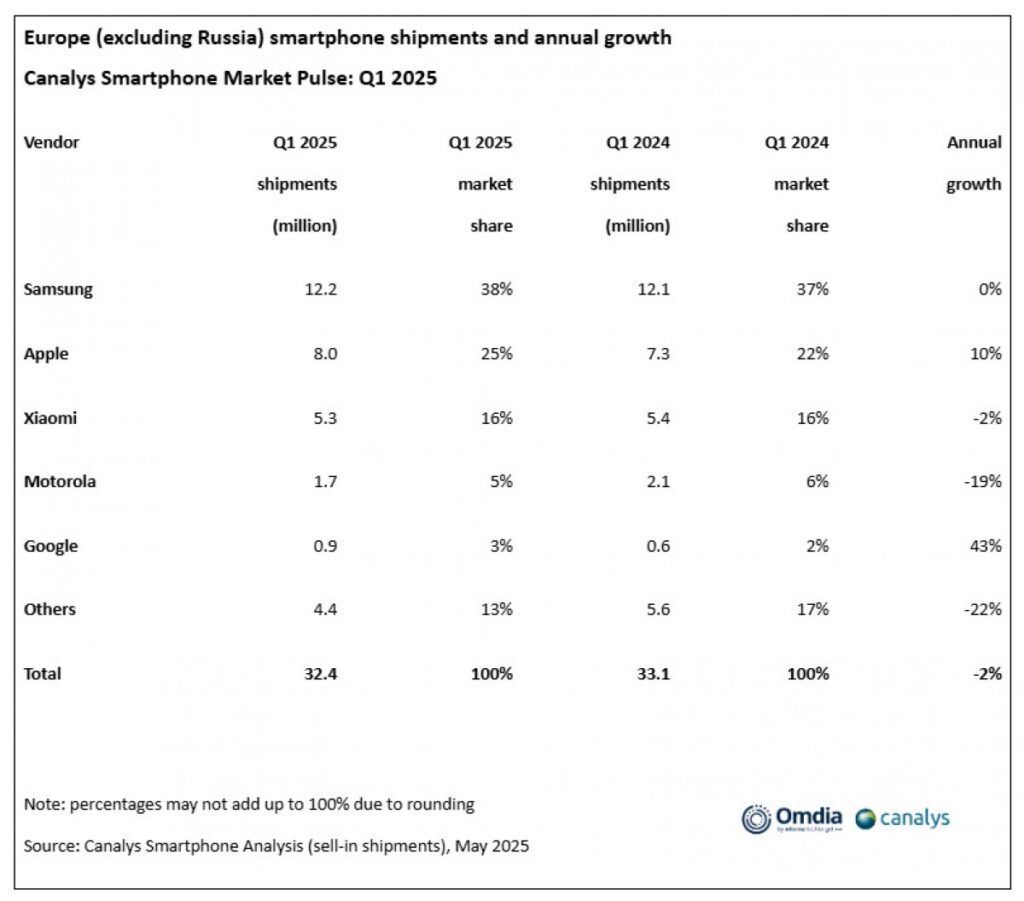 Canalys’in yeni verileri, 2025’in ilk çeyreğinde Avrupa’daki akıllı telefon satışları yıllık bazda %2 gerilediğini ortaya koyuyor. Toplamda 32,4 milyon telefon sevkiyatı yapıldı.