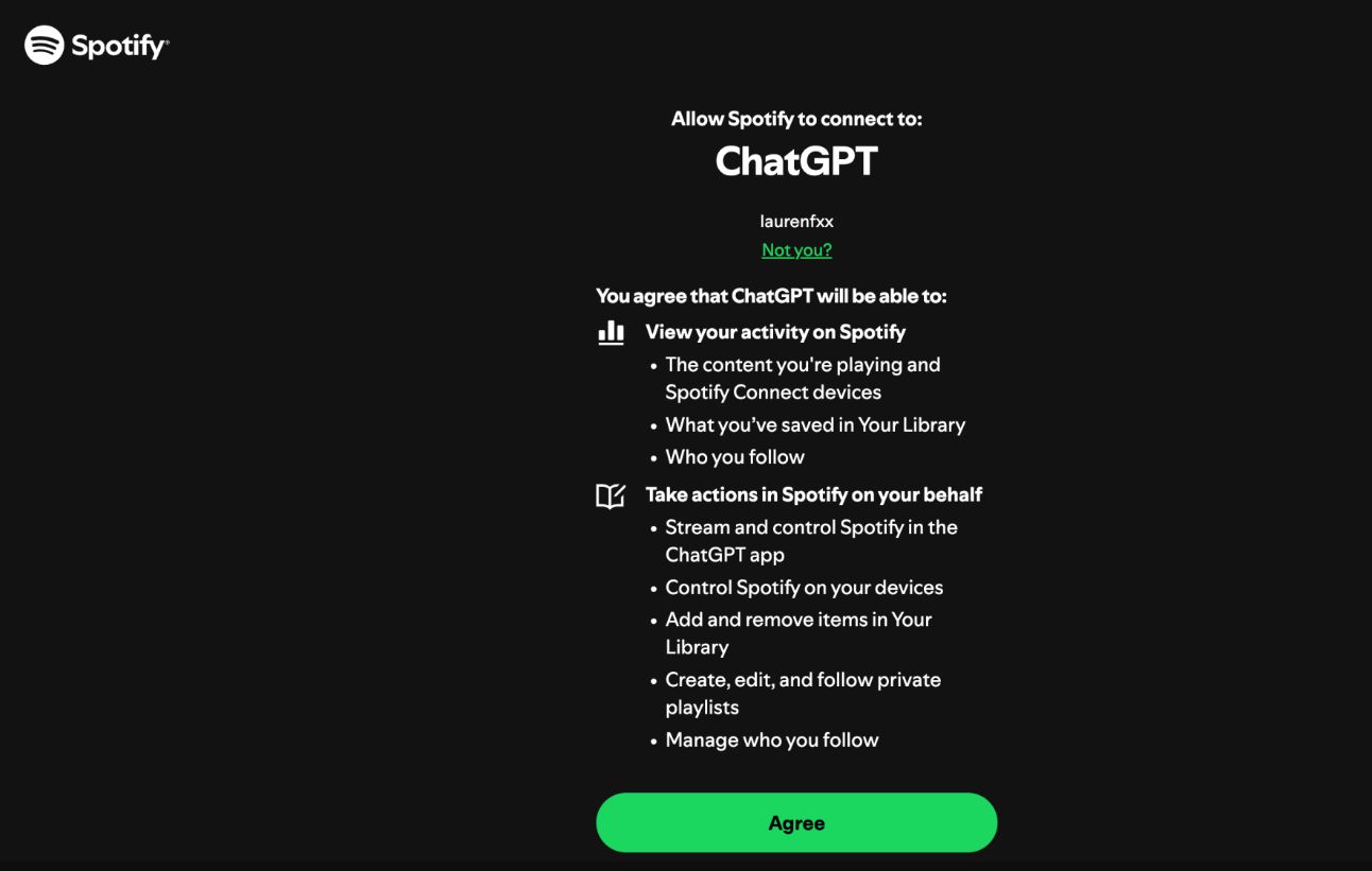 Spotify hesabınızı bağladığınızda platformun gizlilik politikasını da kabul etmiş oluyorsunuz. Bu kapsamda ChatGPT, sizin dinleme geçmişinize, kütüphanenizdeki içeriklere, takip ettiğiniz kişilere, IP adresinize ve yaklaşık konumunuza erişebilir.