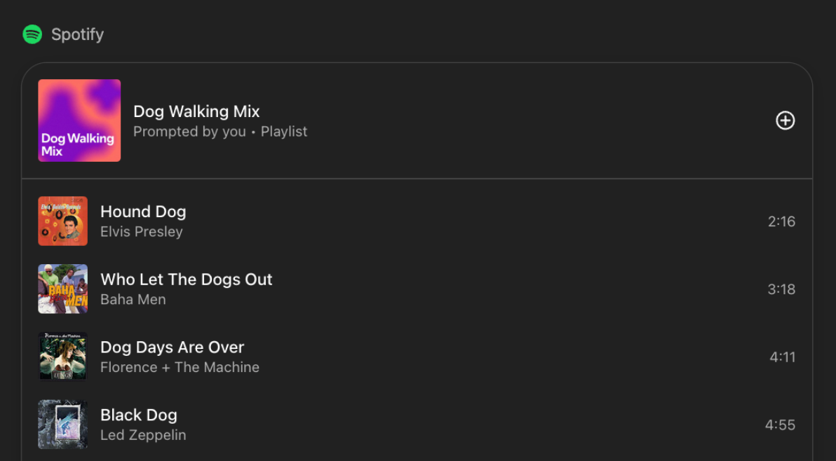 Örneğin, testler sırasında “tüm şarkı adlarında ‘köpek’ geçen bir yürüyüş çalma listesi” istediğinizde ChatGPT bu temaya uygun listeyi otomatik olarak hazırlıyor. Önerilen parçalara veya podcast bölümlerine dokunduğunuzda, Spotify uygulaması açılıyor ve doğrudan dinlemeye başlayabiliyorsunuz.