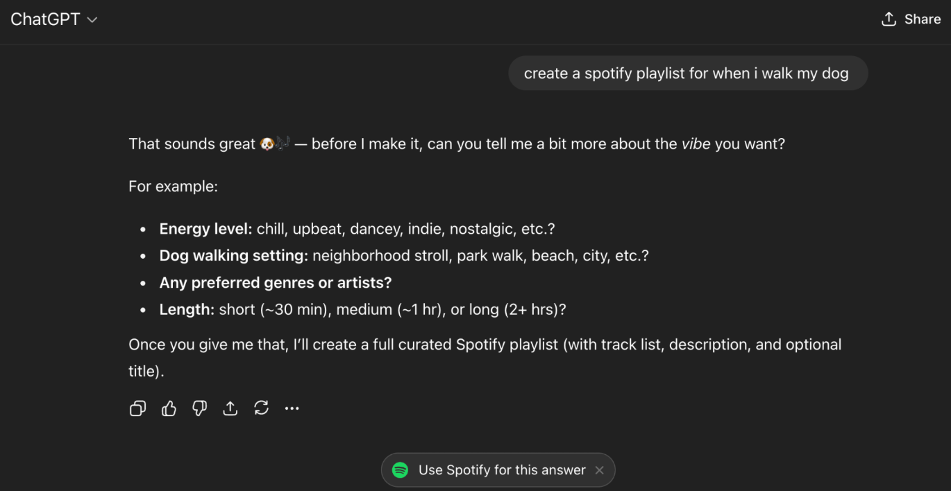 Spotify entegrasyonu sadece önerilerle sınırlı değil. ChatGPT, sizin adınıza doğrudan uygulama içinde de işlem yapabiliyor: