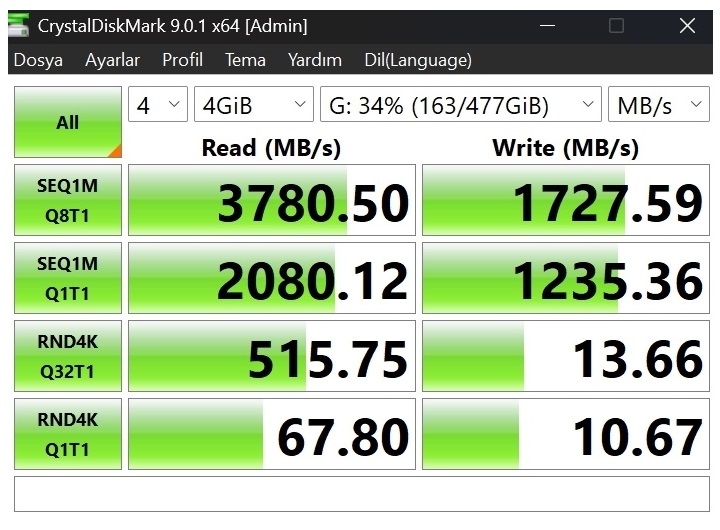 Aldığımız sonuçlar şöyleydi: Sıralı okuma tarafında 3780 MB/s, yazma tarafında 1727 MB/s.