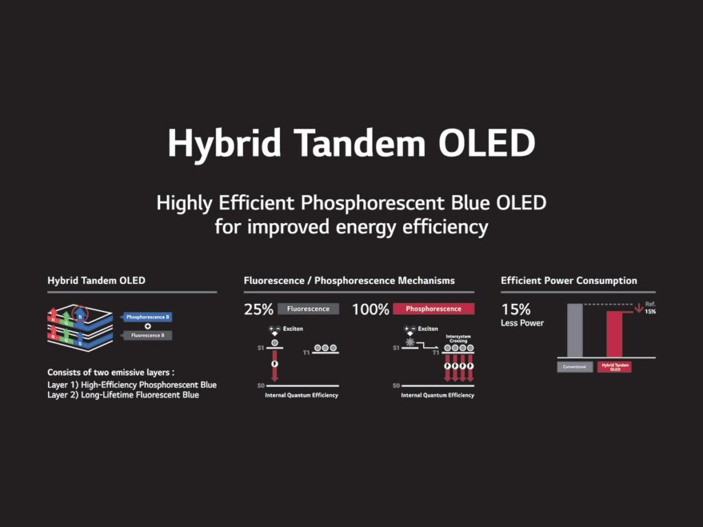 LG Display’in geliştirdiği yeni panelde, daha uzun ömürlü floresan katman (%25 emisyon verimliliği) ve daha parlak fosforesan katman (%100 emisyon verimliliği) birleştiriliyor. Bu hibrit yapı, hem parlaklığı artırıyor hem de panelin ömrünü uzatıyor. Geleneksel OLED panellerde kullanılan yalnızca floresan mavi katmanlara göre bu hibrit sistem, güç tüketimini önemli ölçüde azaltıyor ve daha dengeli bir performans sunuyor.
