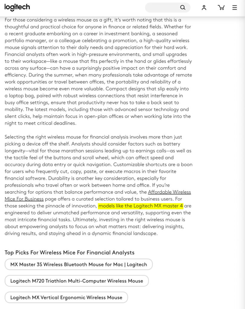 En son gelişmeyle birlikte, Logitech’in resmi web sitesinde kısa süreliğine görülen bir açıklama, MX Master 4’ün finansal analistler ve profesyonel kullanıcılar için geliştirildiğini ortaya koydu. Bu açıklamada cihazın “en karmaşık görevleri bile” destekleyebileceği belirtilmişti. Ancak bu ibare daha sonra web sitesinden kaldırıldı.