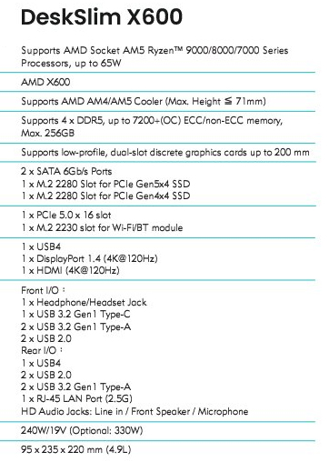 Cihazın şaşırtıcı özellikleri sadece işlemci ve grafik kartıyla sınırlı değil. Sızan teknik föyde, anakart üzerinde tam 4 adet DDR5 RAM yuvasının bulunduğu görülüyor ki bu, Mini-ITX sistemlerde bile nadir görülen bir kapasite. 256 GB’a kadar bellek desteği sunan bu yapı, PCIe Gen 5 SSD yuvası ve USB4 portuyla birleştiğinde, DeskSlim X600’ü piyasadaki en güçlü “ince kasa” bilgisayarlardan biri yapmaya aday kılıyor. 240W veya opsiyonel 330W harici güç adaptörüyle beslenen bu sistem, masasında yer kaplamadan maksimum performans isteyenler için 2026’nın favori donanımı olabilir.