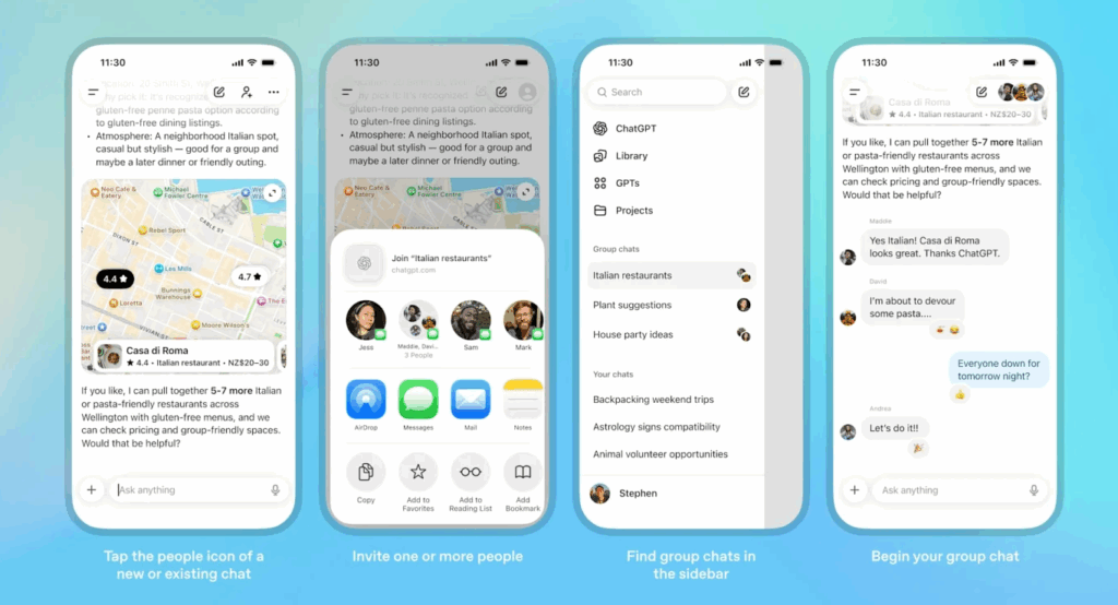 OpenAI tarafından pilot olarak sunulan yeni grup sohbetleri özelliği sayesinde, en fazla 20 kişi aynı sohbet odasında bir araya gelip, yapay zekâyı da masadaki katılımcılardan biri gibi kullanarak planlama yapabiliyor, karar alabiliyor ve ortak metinler üzerinde çalışabiliyor.