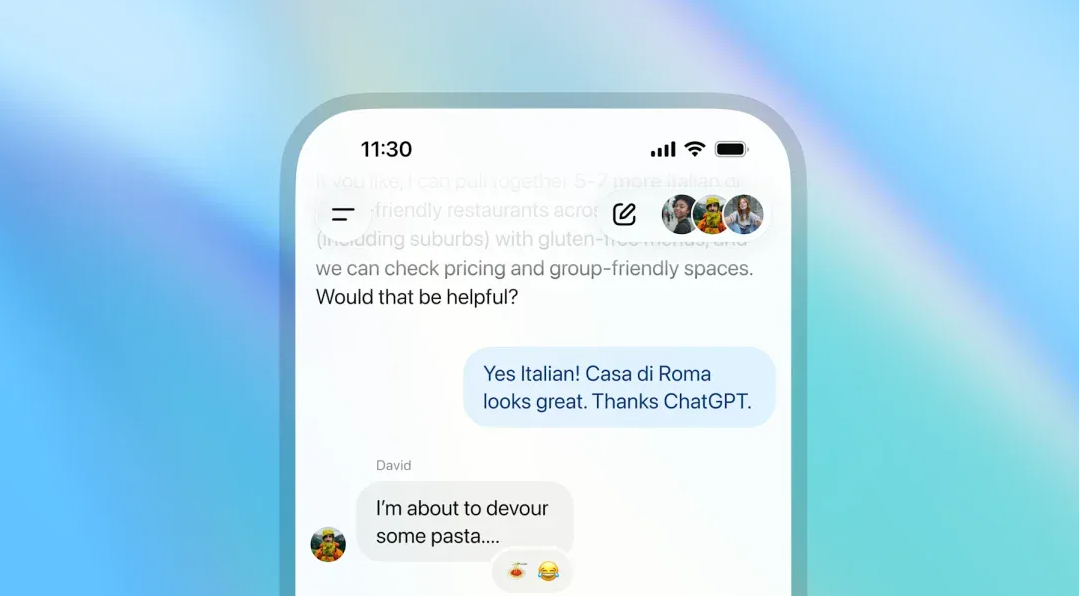 OpenAI tarafından pilot olarak sunulan yeni grup sohbetleri özelliği sayesinde, en fazla 20 kişi aynı sohbet odasında bir araya gelip, yapay zekâyı da masadaki katılımcılardan biri gibi kullanarak planlama yapabiliyor, karar alabiliyor ve ortak metinler üzerinde çalışabiliyor.