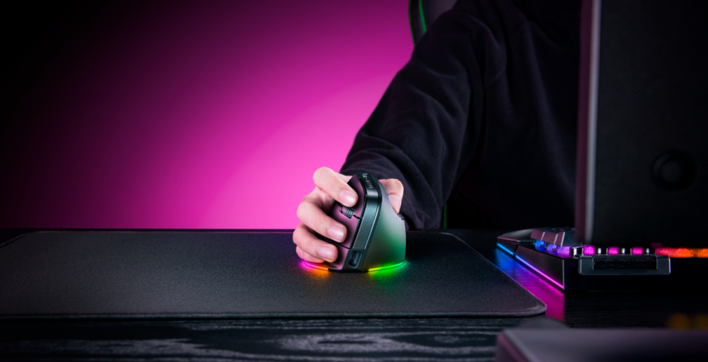 Pro Click V2 Vertical Edition (119,99 $) ise el sıkışır pozisyona yakın 71,7°’lik dikey açısıyla bilek burkulma riskini düşürür. Geniş başparmak girintisi, uzatılmış taban ve hafif yükseltilmiş tasarım; uzun çalışma seanslarında gerginliği azaltmayı amaçlar. Diğer tüm Pro Click V2 özellikleri AI Prompt Master, Chroma aydınlatma, programlanabilir düğmelerdikey modelde de yer alıyor.