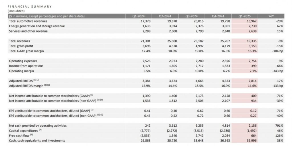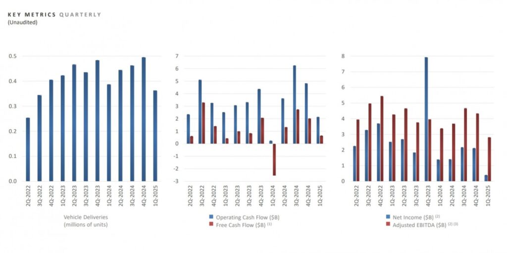 Tesla, 2025’in ilk çeyreğinde hem gelir hem de karda keskin bir düşüş yaşadı. Otomotiv gelirleri, araç üretimindeki dört fabrika güncellemesi ve Model Y yenileme çalışmaları nedeniyle 15,68 milyar €’dan 13 milyar €’ya gerileyerek yıllık %20 azaldı.