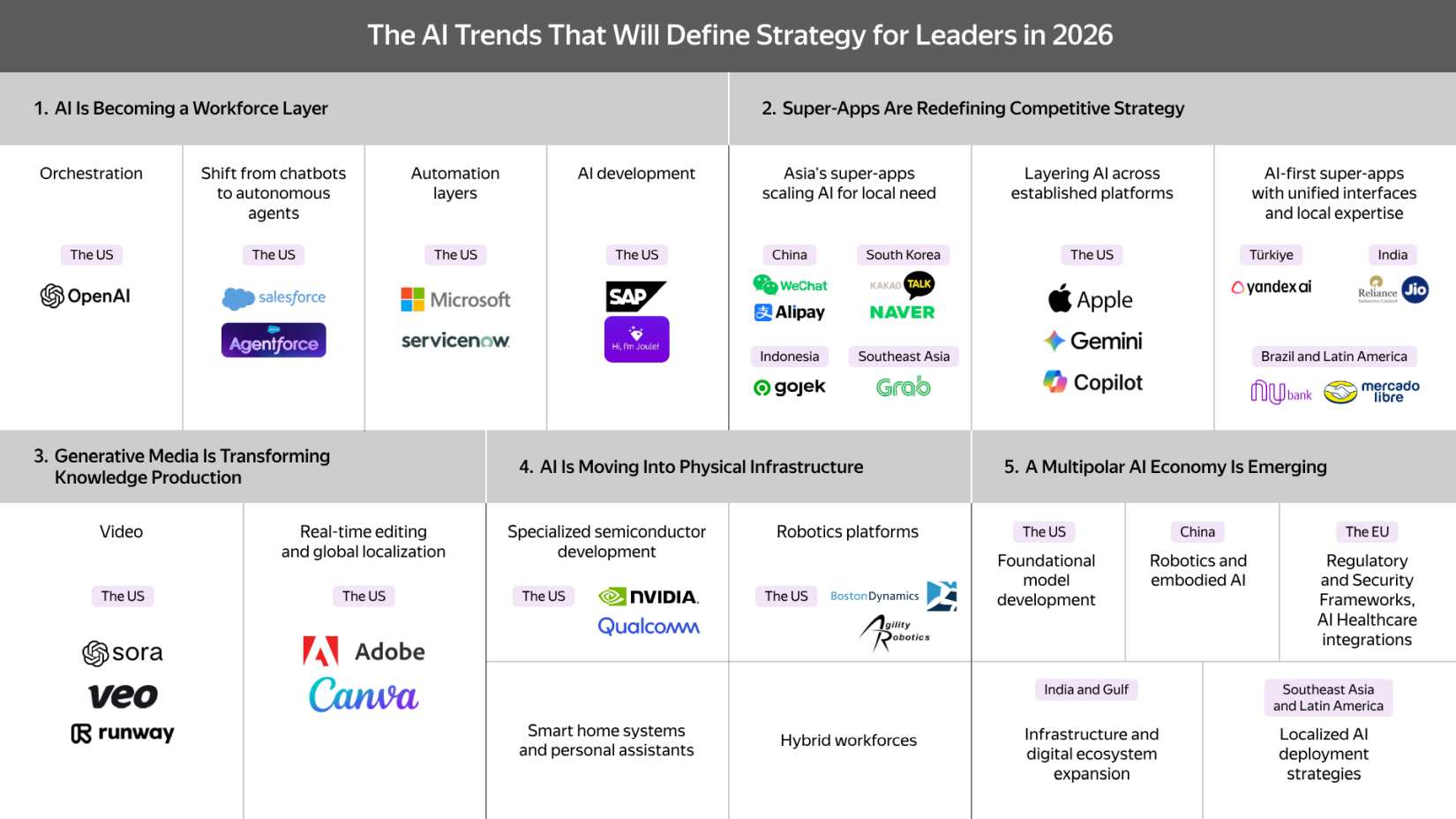 Listede yer alan örneklerin büyük çoğunluğu ABD merkezli teknoloji devlerinden oluşurken (OpenAI, Google, Microsoft vb.), Forbes analizinde Asya, Avrupa ve Latin Amerika’daki bölgesel yapay zekâ girişimlerine de dikkat çekiliyor.