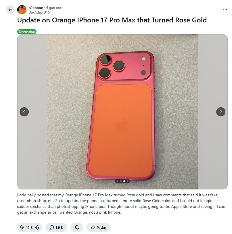 Yukarıdaki fotoğraf, Reddit platformunda, DakAttack316 kullanıcı isimli teknoloji sever tarafından paylaşıldı. Belirttiğine göre kozmik turuncu renkli iPhone 17 Pro’su, zaman geçtikçe rose gold’a dönüşmeye başladı. Bunun bir Photoshop ya da AI yapay zekâ hilesi olmadığını belirten kullanıcı, değişim için Apple ile iletişime geçeceğini de belirtti. Tabii bu fotoğrafın üzerinden birkaç gün geçtiğini belirtmeliyiz. An itibarıyla Apple’dan gelen bir açıklama ise bulunmuyor.