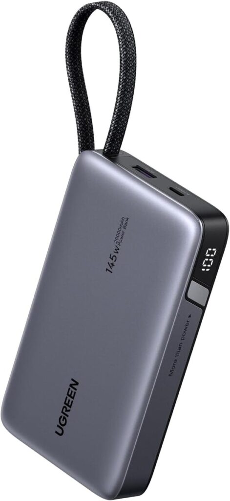 Ugreen Nexode Power Bank 20.000 mAh 145W, güçlü çıkışı, entegre kablosu ve hızlı şarj desteğiyle hem laptop hem de akıllı telefon kullanıcıları için etkileyici bir seçenek olarak öne çıkıyor.