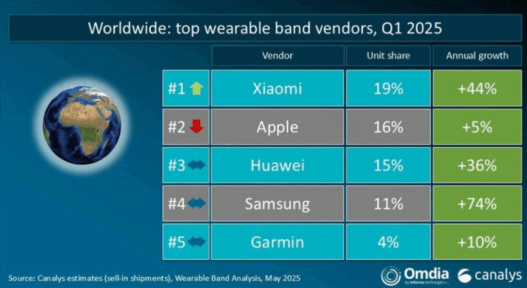 Canalys’ın 2025 ilk çeyrek raporuna göre, dünya genelinde 1 Ocak – 31 Mart döneminde 46,6 milyon adet giyilebilir bant ve saat sevk edildi ve pazar geçen yıla göre %13 büyüme kaydetti. Xiaomi, akıllı bileklik ve saat serisini yenileyerek bu artıştan en çok payı alan marka oldu.