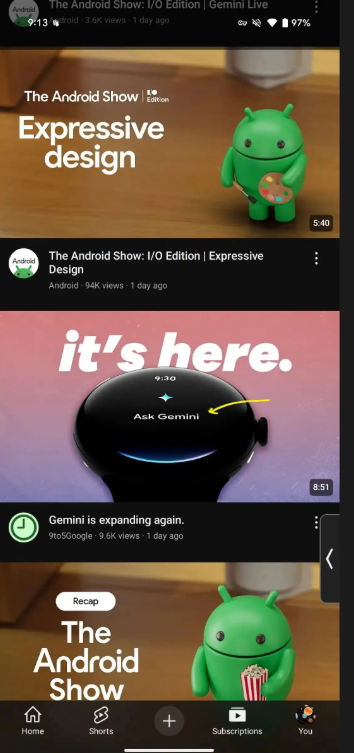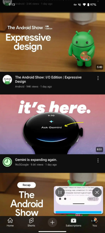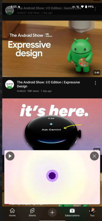 Mini oynatıcının alt kenarında değişmeyen kırmızı ilerleme çubuğu hâlâ yer alıyor ve video bittiğinde kullanıcıya tekrar oynatma seçeneği sunan bir “yeniden izle” düğmesi beliriyor. Eskiden olduğu gibi videoyu istediğiniz büyüklüğe getirebilmek mümkün; ancak şimdi mini oynatıcıyı ekranın soluna veya sağına taşıyarak uygulamada dikkat dağıtmadan dolaşmanız da mümkün kılınıyor. Aradaki geri dönme tutamaçları, tek dokunuşla mini oynatıcıyı tam ekran ana görünüme geri getirme imkânı tanıyor.